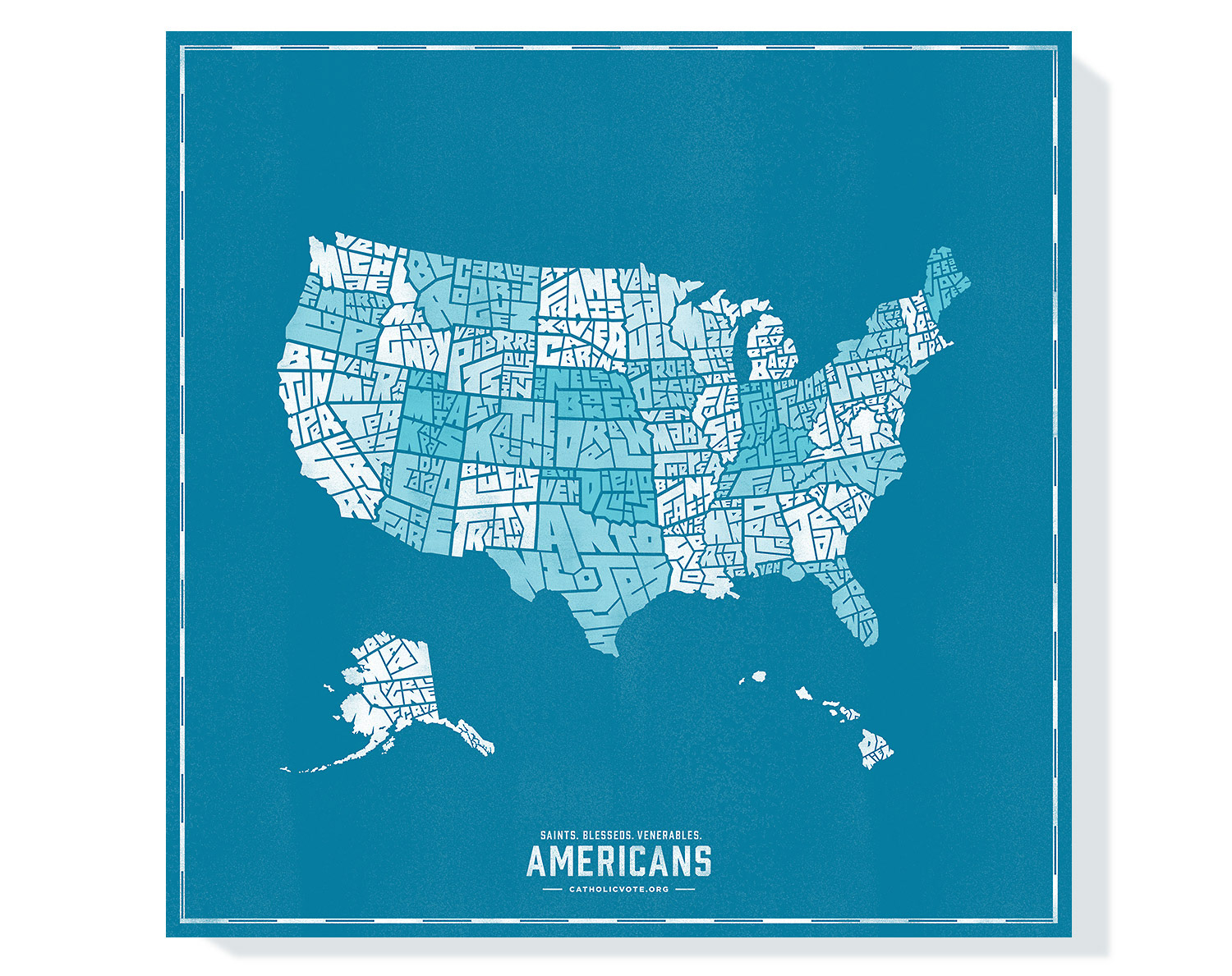 This custom-designed and illustrated poster contains the names of all American Saints, Blesseds and Venerables.